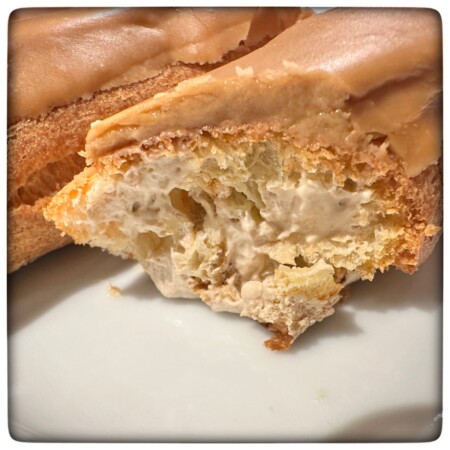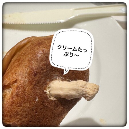 エスプレッソクリームがエクレア細長のシューの中にしっかり入っていて、かじると底の注入穴からはみ出すので気をつけて〜。