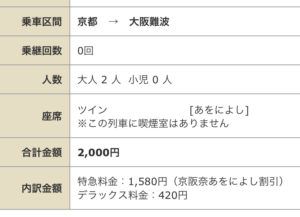 乗車料金(大阪難波〜京都 960円)と特急料金(大阪難波〜京都 920円)に加え、デラックス料金(特別車両料金)が距離に関係なく一律210円がかかります。