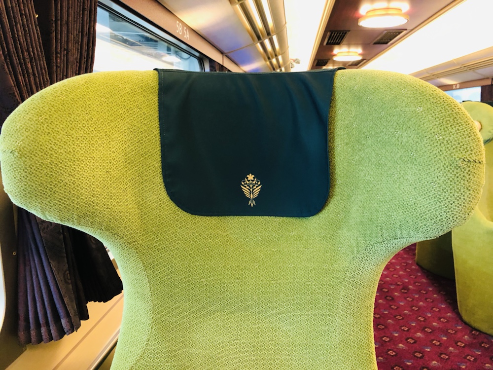 ツインシート(2人用)の他、半個室タイプのサロンシート(3~4人用)があります。4料編成で全84席。他の通常特急に比べて、3分の1の座席数という贅沢な空間です。ツインの座席は背もたれが包み込む感じに広々としていて、かなりゆったりとしています。