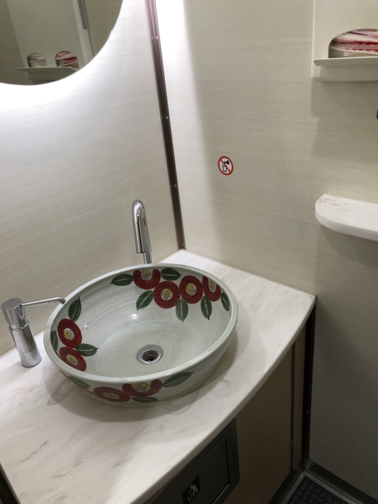 トイレの手洗い場もかわいいし、完全に観光列車な感じです。ただ、結構揺れるので動いてる時に歩くとよってしまうかもしれません。