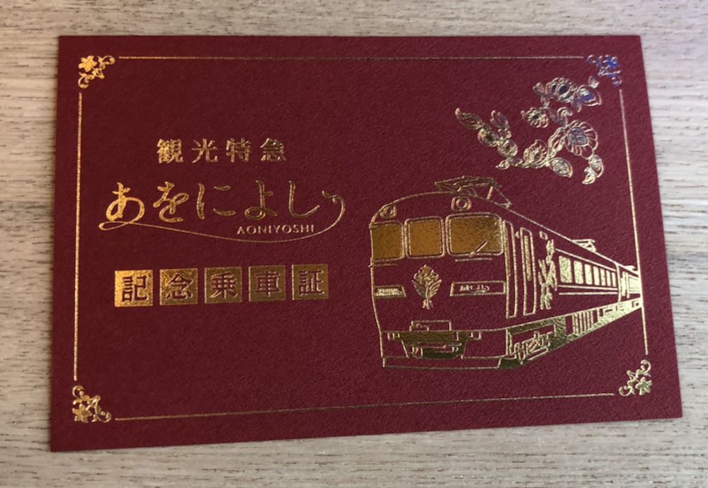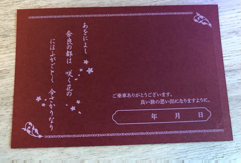 赤い色紙に金文字の記念乗車証は、2号車の食堂車のレジ前でもらえました。