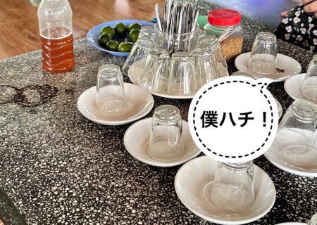 なぜって、ハチミツ茶をサービスされるらしく、蜂蜜の香りに寄せられてテーブルに置かれたコップ付近にもハエじゃなくて蜂がいる・・・。もちろん目の前にも飛んでくる。思わず席から離れてしまう。