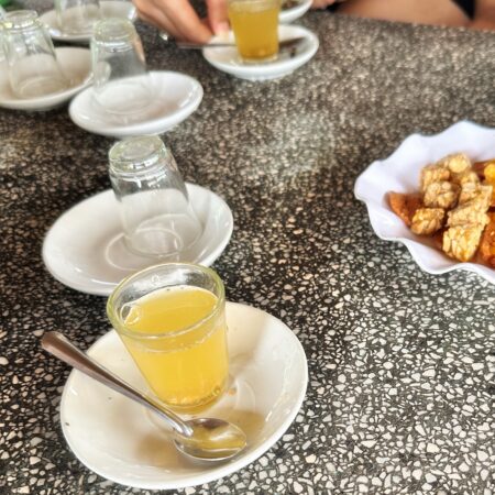 ジャスミンティーにフレッシュな蜂蜜を混ぜたお茶。とても気に入った。周りに蜂がいなければもう1杯おかわりして飲みたいところだったけど、落ち着いて飲めないのが悩みどころ。