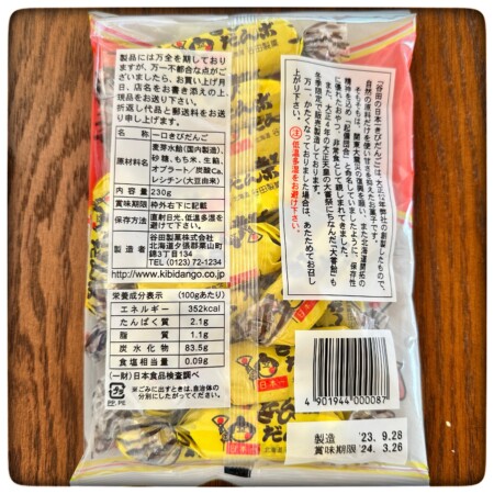 なぜボがカタカナかなでしかもボッてどういこと?と思いましたが、実際はカタカナの「ボ」ではなく、昔の旧字体で「ご」と読むらしいです。商品名称は公式ページにも、袋の裏面にも「一口きびだんご」になっています。