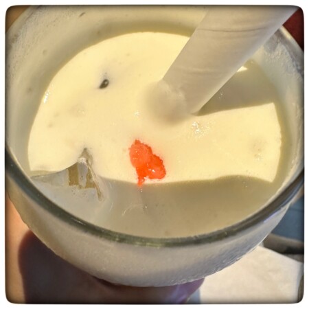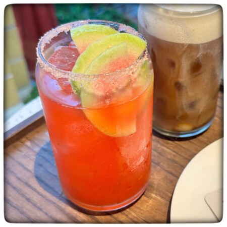 Pink Guava Teaには、若々しいピンクグァバの果肉。そして、おしゃれアルコールドリンクみたいな塩つきのグラスです。