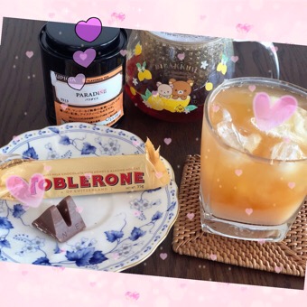 アイスティーにして、リラックマ缶のキャラメルチョコレートをおともにいただきました。