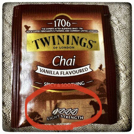 オーストラリアまたはニュージーランドのTwiningsのチャイ「Chai Vanilla」は、チャイなのに甘いバニラのフレーバーが入っていてちょっと珍しいです。ティーパックで10パック入りと80パックの大容量入りがあります。