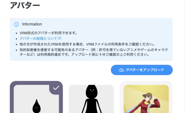 今回、初めてアバターを作ってみてclusterにアップロードしてみました。ファイル形式にVRMが利用できると記載されています。